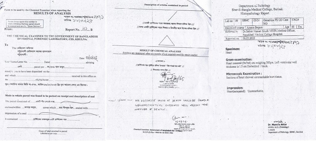 এ ব্যাপারে পটুয়াখালী মেডিকেল কলেজ হাসপাতাল স্মারক নং- পমেকহা/পটুয়া/২০২৫/৭১, তারিখ : ১৬/০৩/২৫ ইং প্রতিবেদন দেন। তাতে লাশের শরীরে কোন আঘাতের চিহ্নের কথা উল্লেখ নাই। তারপরও মামলার তদন্ত কর্মকর্তা সোহেল রানা বিভিন্ন তালবাহানা শেষে মামলার চার্জসিট থেকে ০৩ জন আসামিকে বাদ দিয়ে আবার ০১ জনকে অন্তর্ভূক্ত করে চার্জসিট প্রদান করেন। তিনি চার্জসিটে উল্লেখ করেন, ঘটনার দিন আসামীরা বাদীপক্ষের লোকজনকে দড়ি দিয়া গাছের সাথে বাঁধিয়া এলোপাথারী মারপিট করিয়া তাদের শরীরের বিভিন্ন স্থানে নীলা ফুলা জখম করে। ০১ আসামি বাদীর মাকে পূর্ব পরিকল্পিতভাবে হত্যার উদ্দেশ্যে বুকে ঘুষি মারিলে বাদীর মা মাটিতে পড়ে যায়। তখন ০২ নং আসামি বাদীর মায়ের মৃত্যু নিশ্চিত করার জন্য তাহার তলপেটে স্বজোড়ে লাথি মারিলে বাদীর মা ঘটনাস্থলে বেহুশ হয়ে মাটিতে পড়ে থাকে। যার আদৌ কোন সত্যতার উল্লেখ নাই মেডিকেল রিপোর্টে। জানা গেছে, তিনি মামলার ফাইনাল দিতে ২০ লক্ষ টাকা দাবি করেন। আসামীপক্ষ ৪ লাখ টাকা প্রদান করেন। তাতে খুশি হতে পারেননি মামলার তদন্ত কর্মকর্তা।
